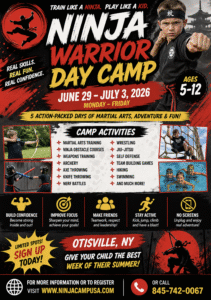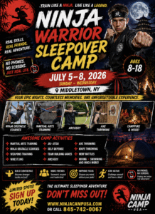 Your camper will learn Ninjutsu by training and living like a Ninja! Limited Space! Reserve your child’s spot now! Click on ‘Get more info’ to see camp descriptions, cost, location, etc. -Sensei Macaluso